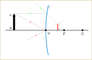 É dado um espelho esférico convexo. C é o centro de curvatura, F o foco principal e V o vértice do espelho. Construa a imagem A’B’ do objeto AB e responda: a imagem é real ou virtual, direita ou invertida, maior ou menor do que o objeto?